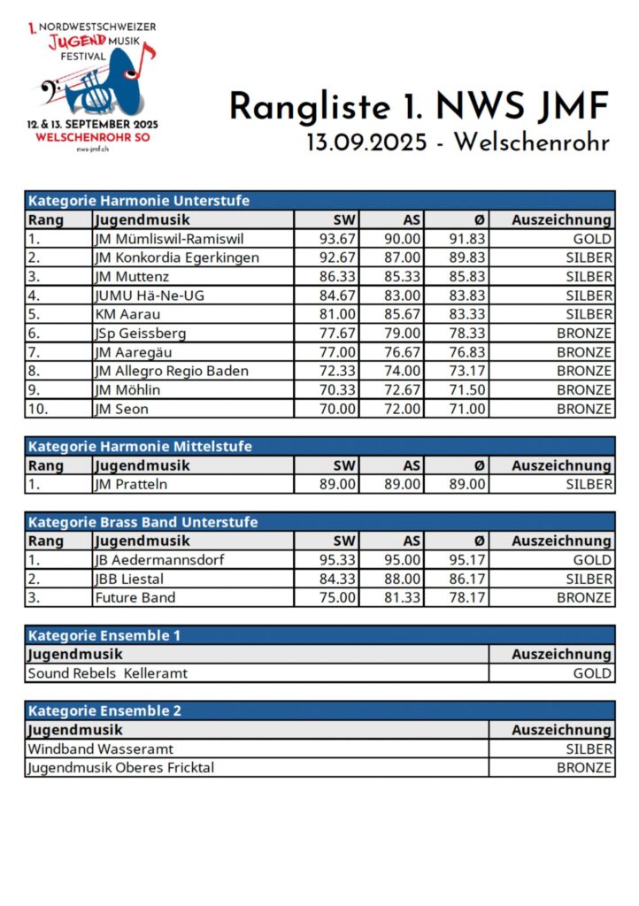 Mit dem 4. Platz durfe auch die Jugendmusik UG-HÄ-NE einen tollen Erfolg feiern. Der 7. Rang der Jugendmusik Aaregäu rundet den Erfolg der Formationen aus unserem Verbandsgebiet ab.